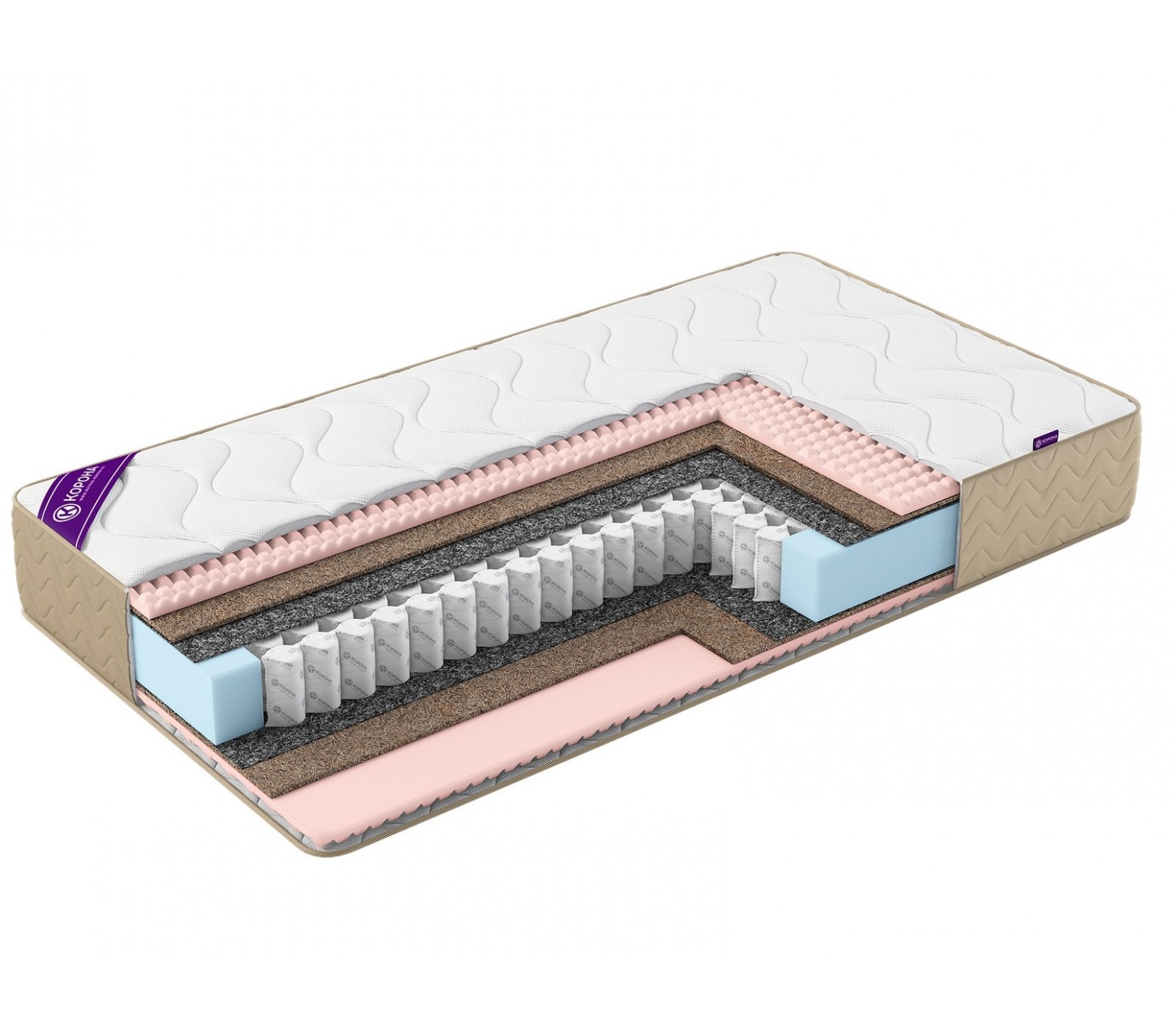 Комфортный матрас средней жесткости на основе блока независимых пружин равномерно распределяет нагрузку по всей поверхности и обеспечивает поддержку позвоночника. В качестве наполнителя используется натуральное латексированное кокосовое волокно и ормафом, придающий комфорт.