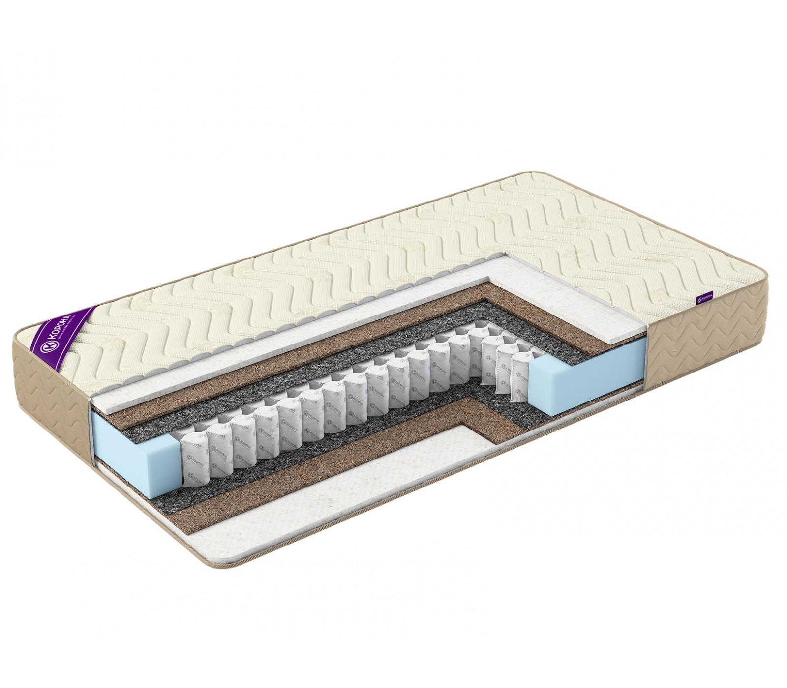 Комфортный матрас средней жесткости на основе блока независимых пружин равномерно распределяет нагрузку по всей поверхности и обеспечивает поддержку позвоночника. В качестве наполнителя используется натуральное латексированное кокосовое волокно и струттофайбер, придающий комфорт.