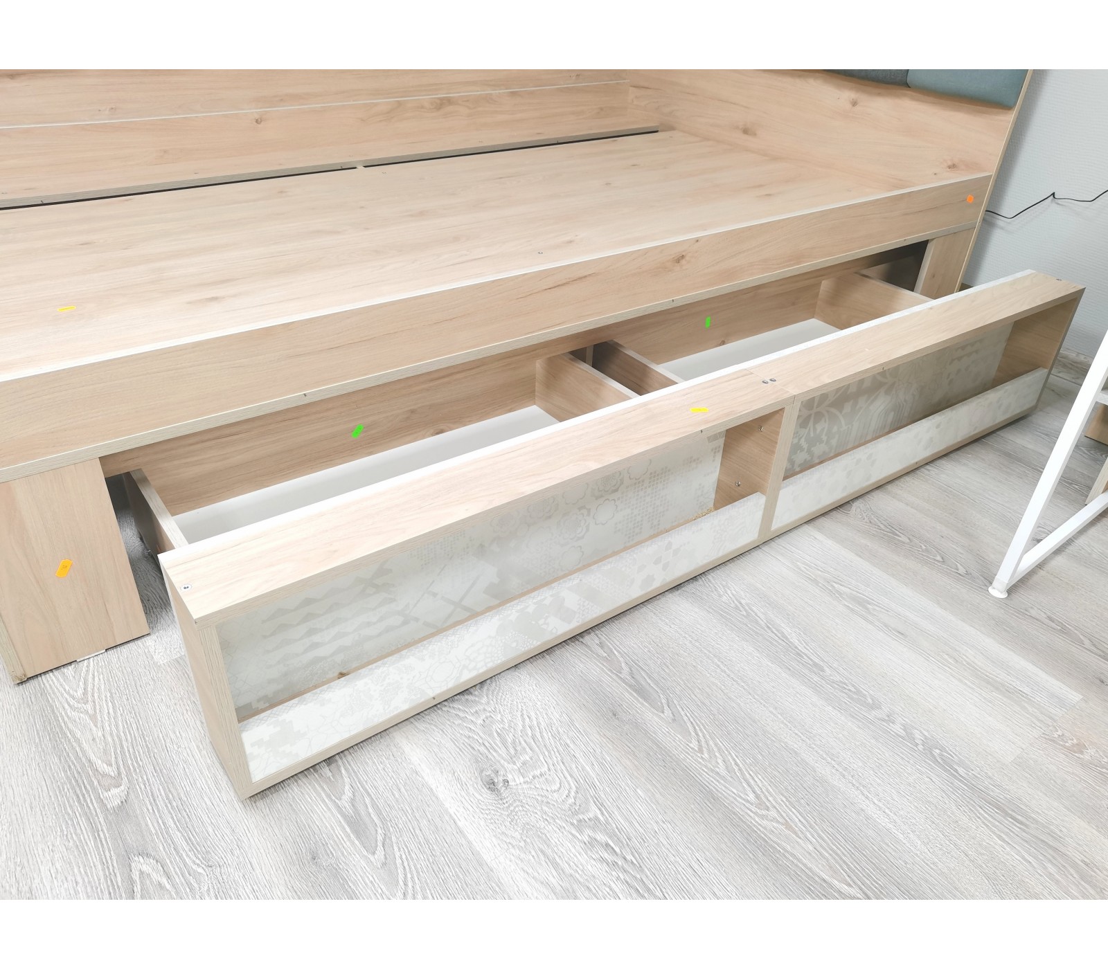 Кровать имеет два выкатных ящика на роликовых опорах, открываются одновременно.