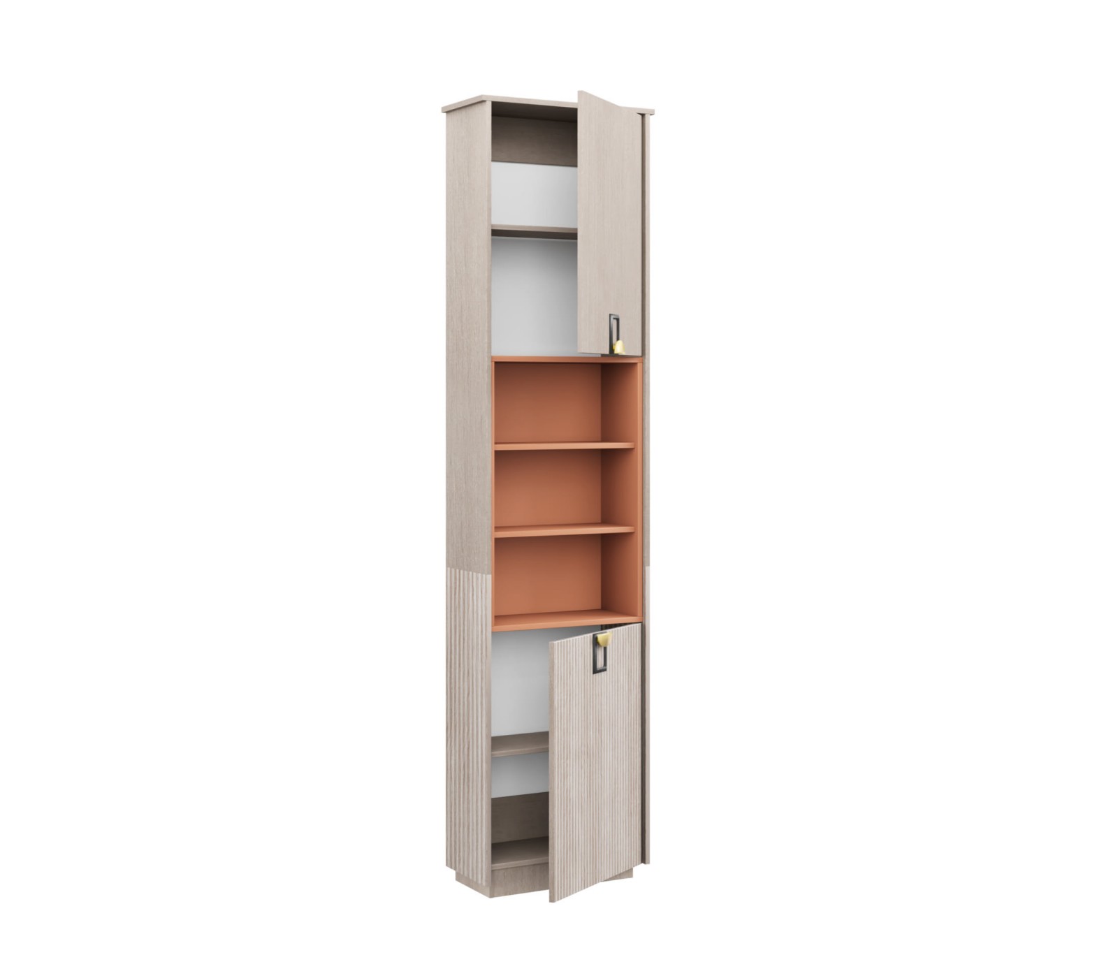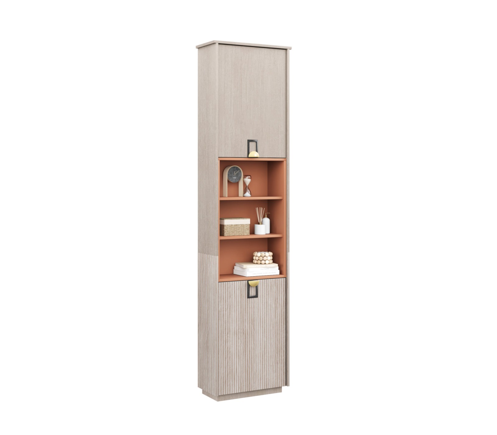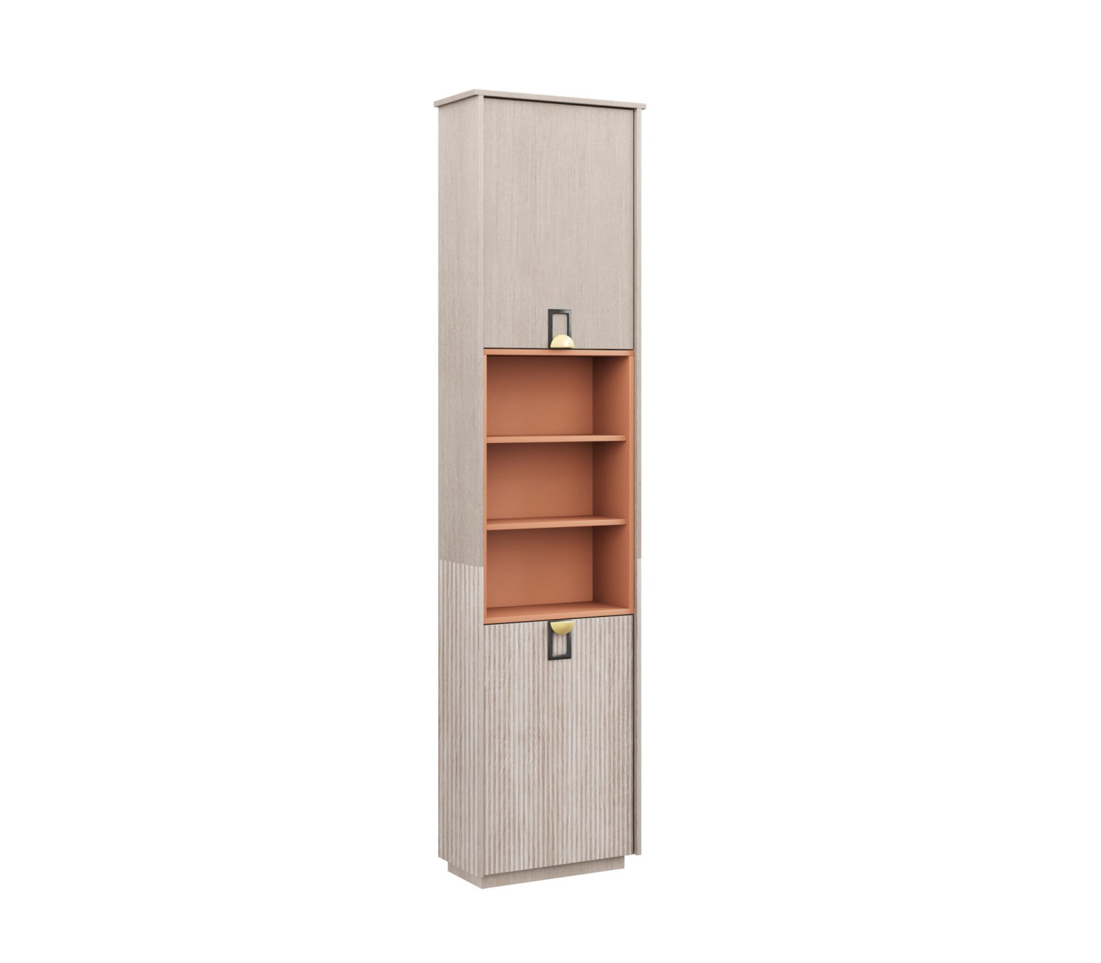 Корпус ЛДСП цвета светлого дерева. Ручка матовая золото/черный цвет. Фурнитура дверей с плавным ходом. Вставка цвета Терракот