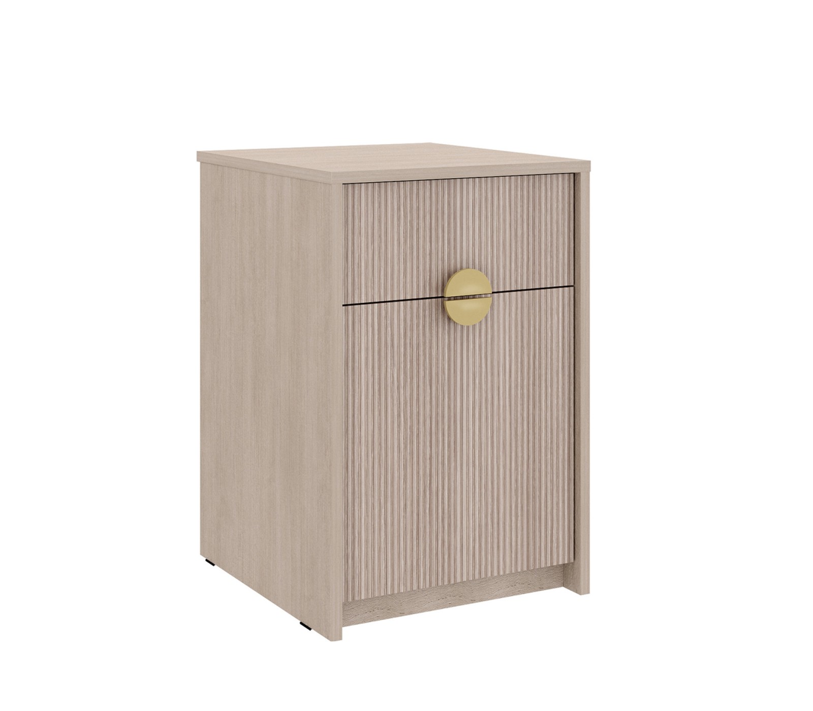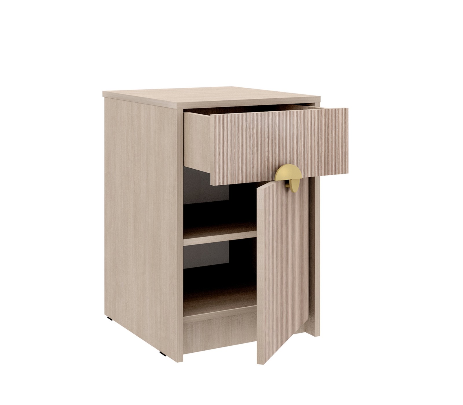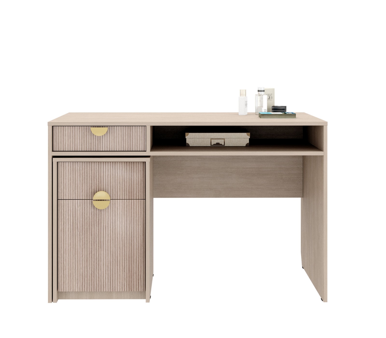 Тумба туалетного столика двухсекционная Муза с дверцей и ящикам. Корпус ЛДСП 16 мм. Фасады рифлёные. Ручка матовая золото/черный цвет. Фурнитура плавного закрывания скрытая нижнего крепления. Петли плавного закрывания.