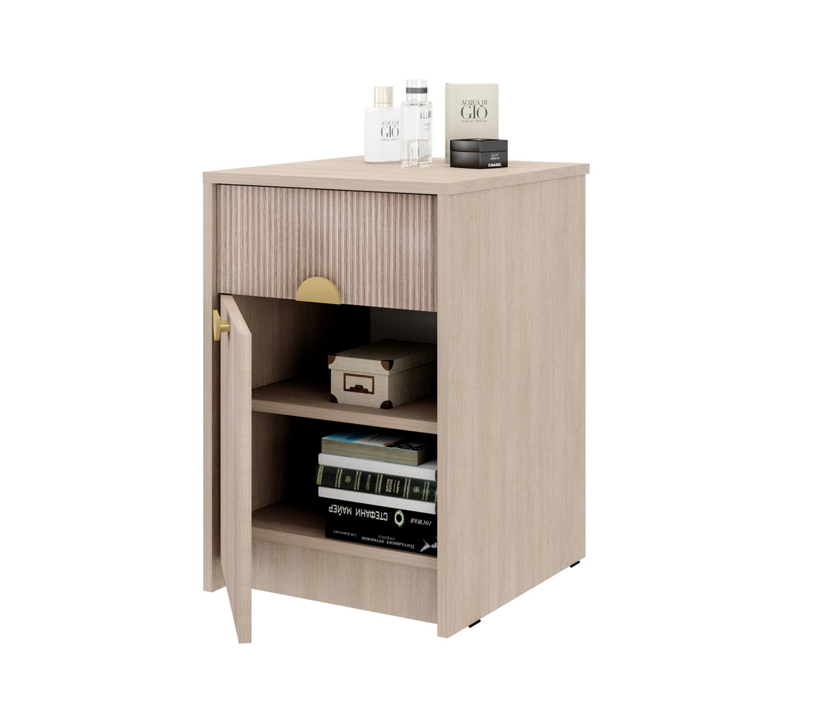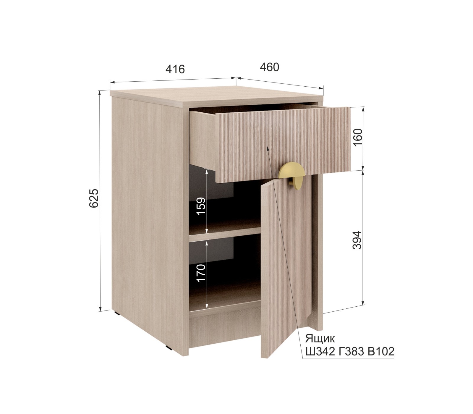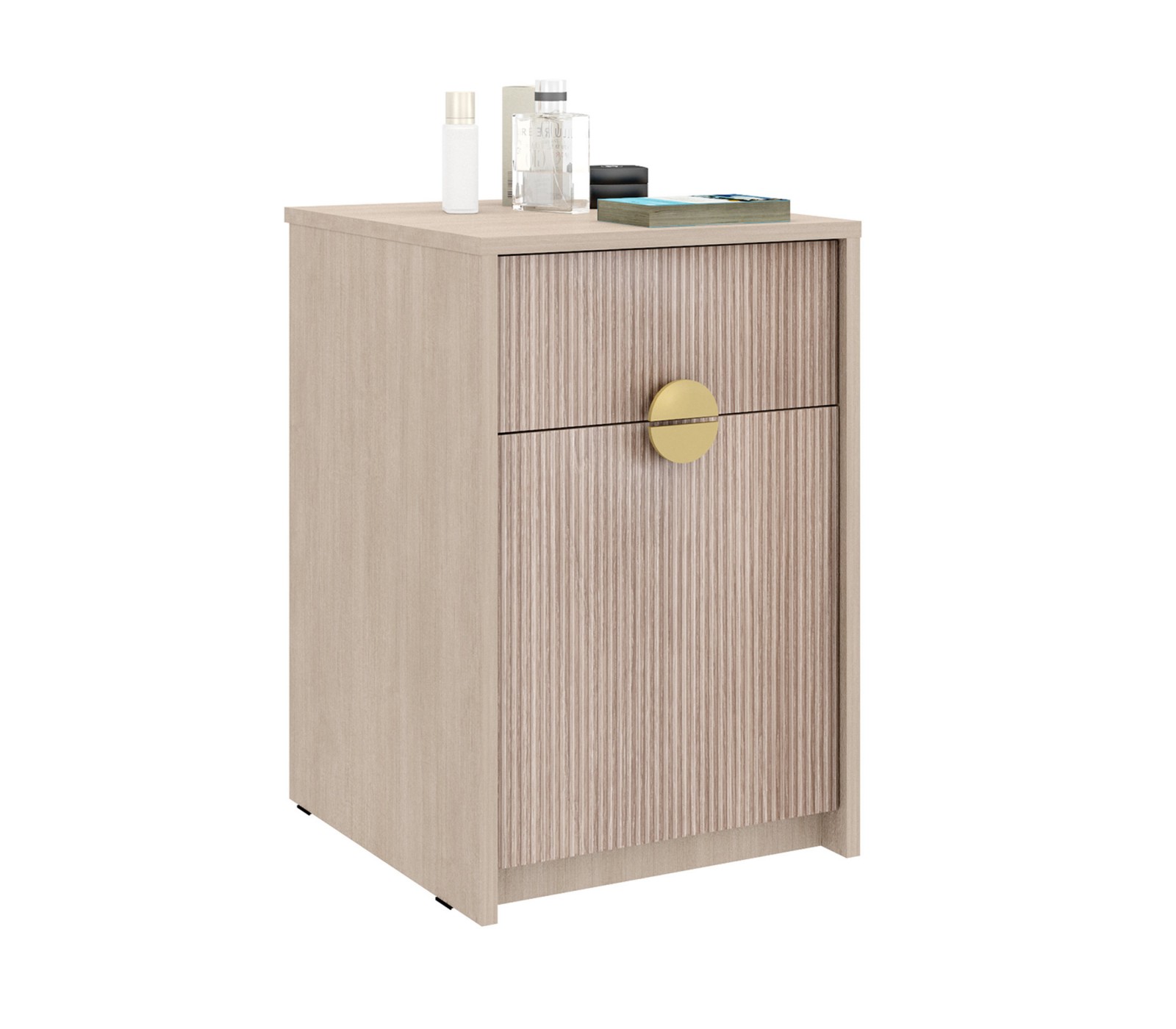Тумба туалетного столика двухсекционная Муза с дверцей и ящикам. Корпус ЛДСП 16 мм. Фасады рифлёные. Ручка матовая золото/черный цвет. Фурнитура плавного закрывания скрытая нижнего крепления. Петли плавного закрывания.